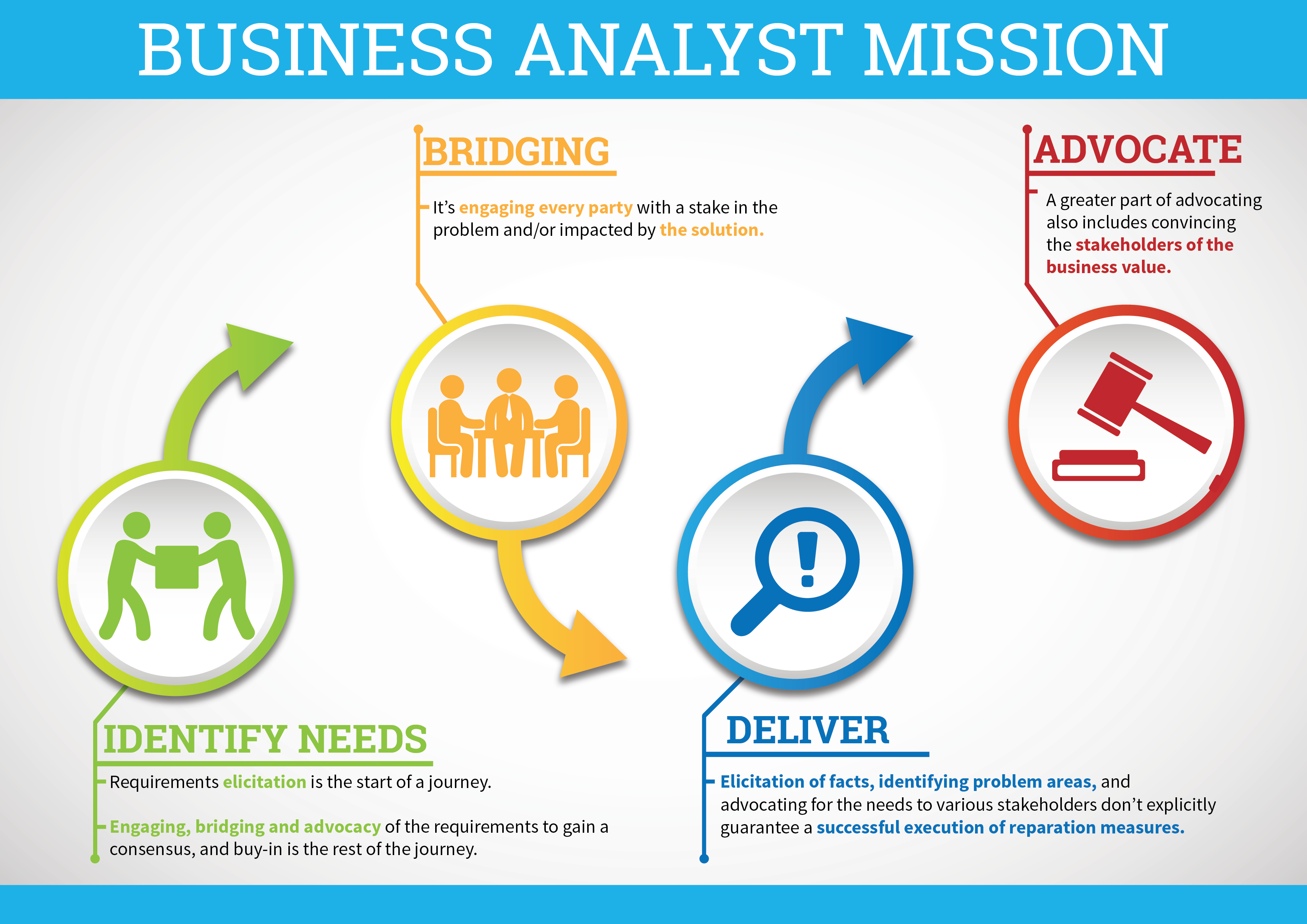 Analitycy biznesowi muszą analizować i łączyć informacje dostarczane przez wiele stron współdziałających z firmą: klientów, pracowników, specjalistów IT i kierowników. Analityk jest odpowiedzialny za wyłuskanie rzeczywistych potrzeb interesariuszy, często przyczynia się do ułatwiania komunikacji pomiędzy poszczególnymi jednostkami organizacji. W szczególności analitycy biznesowi często odgrywają kluczową rolę w dostosowywaniu potrzeb jednostek biznesowych do możliwości oferowanych przez technologie informatyczne i mogą służyć jako "tłumacz" pomiędzy tymi grupami.
